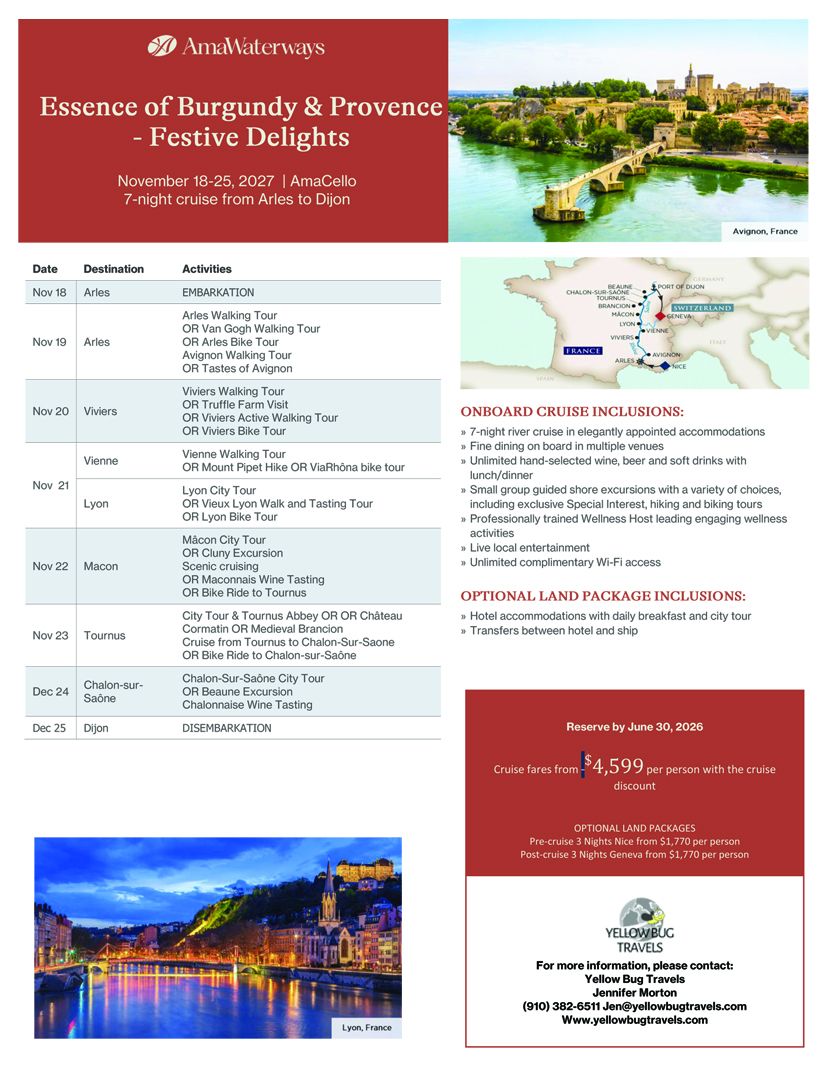 Indulge in French flavors on a palate-pleasing itinerary that highlights the essence of France’s Burgundy and Provence. Uncover the Roman history of Chalon-sur Saône and delight in charming Tournus with its towering Romanesque abbey and historic apothecary shop. Visit French châteaux from Burgundy to Provence, taste your way through the French culinary capital of Lyon and visit the Papal Palace in Avignon. While you’ll get more than a taste of Burgundy and Provence during this itinerary, the essence of these destinations will linger on your palate – and in your heart – for a lifetime!